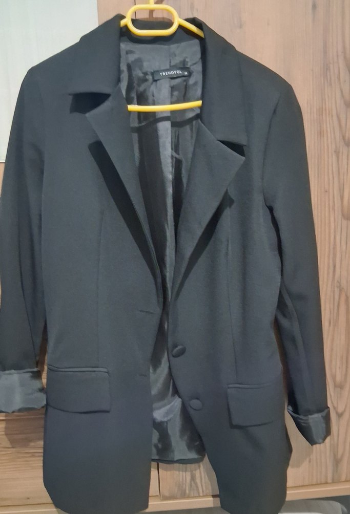 Düğmeli, normal uzunlukta siyah kadın blazer ceket. Notlu yaka ve uzun kollu, sentetik kumaştan, iş ve günlük kullanım için uygun.