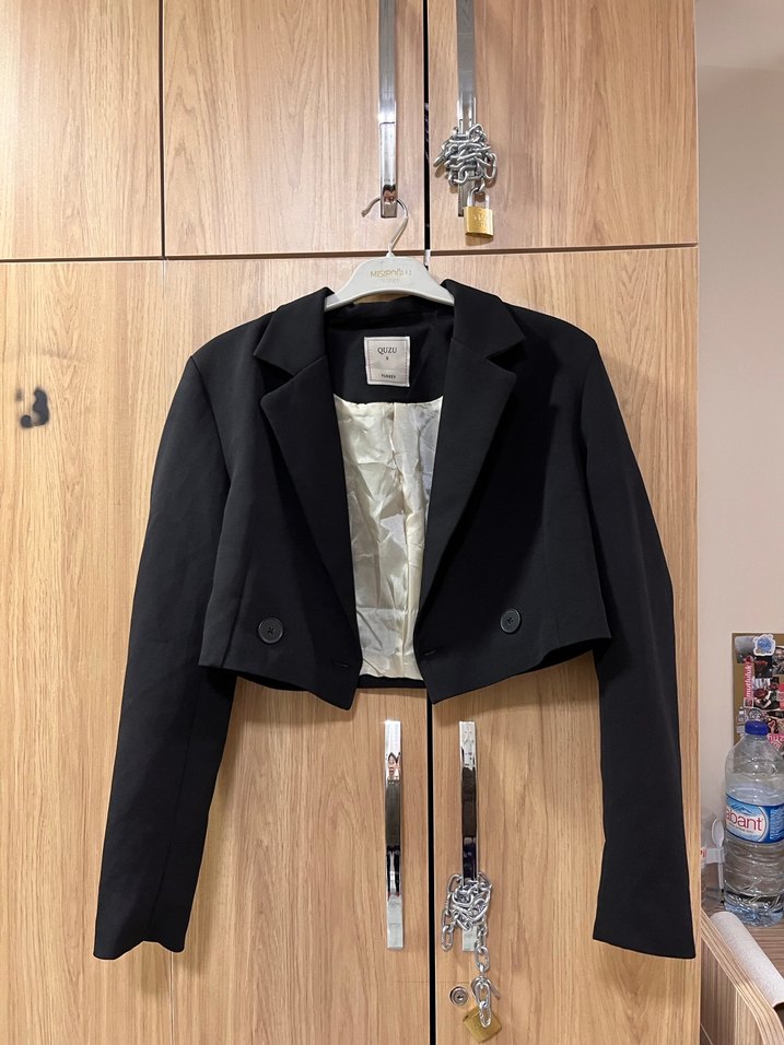 Düğmeli ön kısmı ve keskin yaka detayıyla siyah kadın blazer ceket. Uzun kollu, midi boy ve regular kesim, pürüzsüz sentetik kumaştan üretilmiştir. Ofis için uygun sade tasarım.