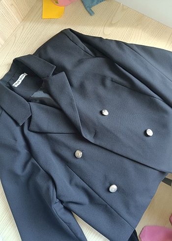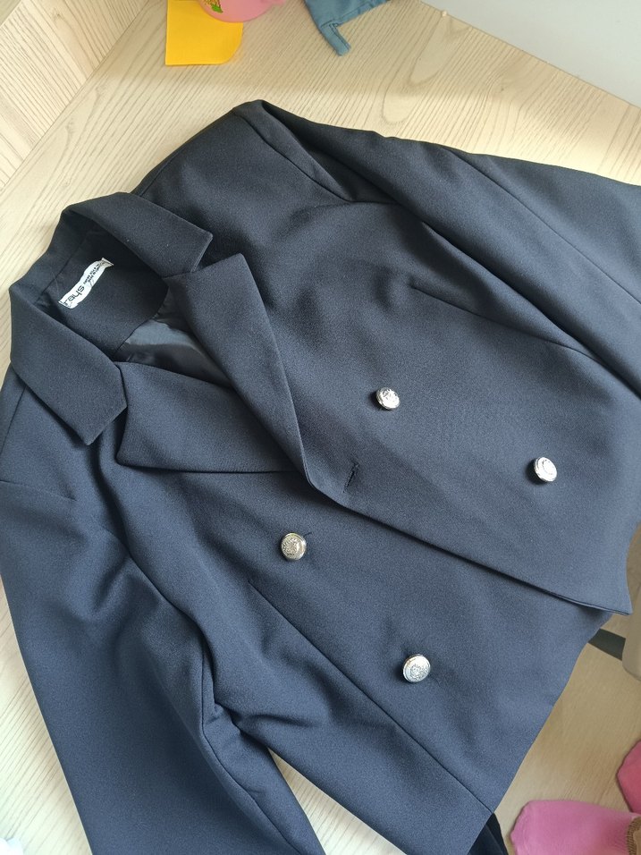 Düğmeli, notalı yakalı, uzun kollu siyah kısa blezır ceket , regular fit ve sentetik kumaştan üretilmiştir. Ofis için uygundur.