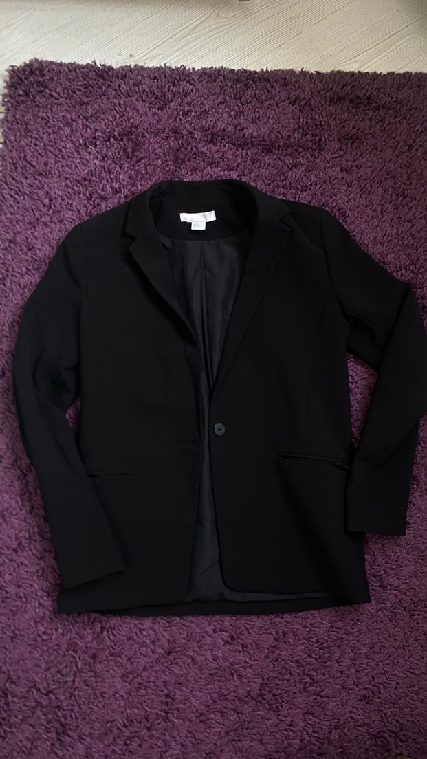 Düğmeli, siyah kadın blazer ceket, kesilmiş yakalı ve uzun kolludur. Normal kesim ve midi boyda, ofis kullanımı için uygundur.