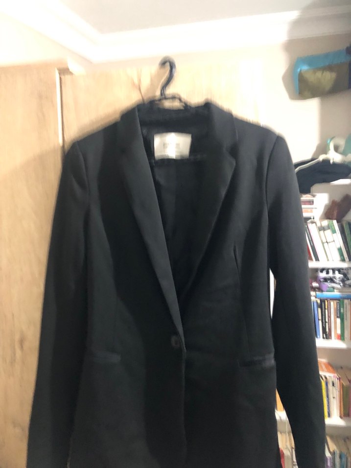 Düğmeli, uzun kollu ve normal kesim siyah kadın blazer ceket. Ofis kullanımı için midi uzunlukta, düz ve desensiz, sentetik kumaştan yapılmıştır.