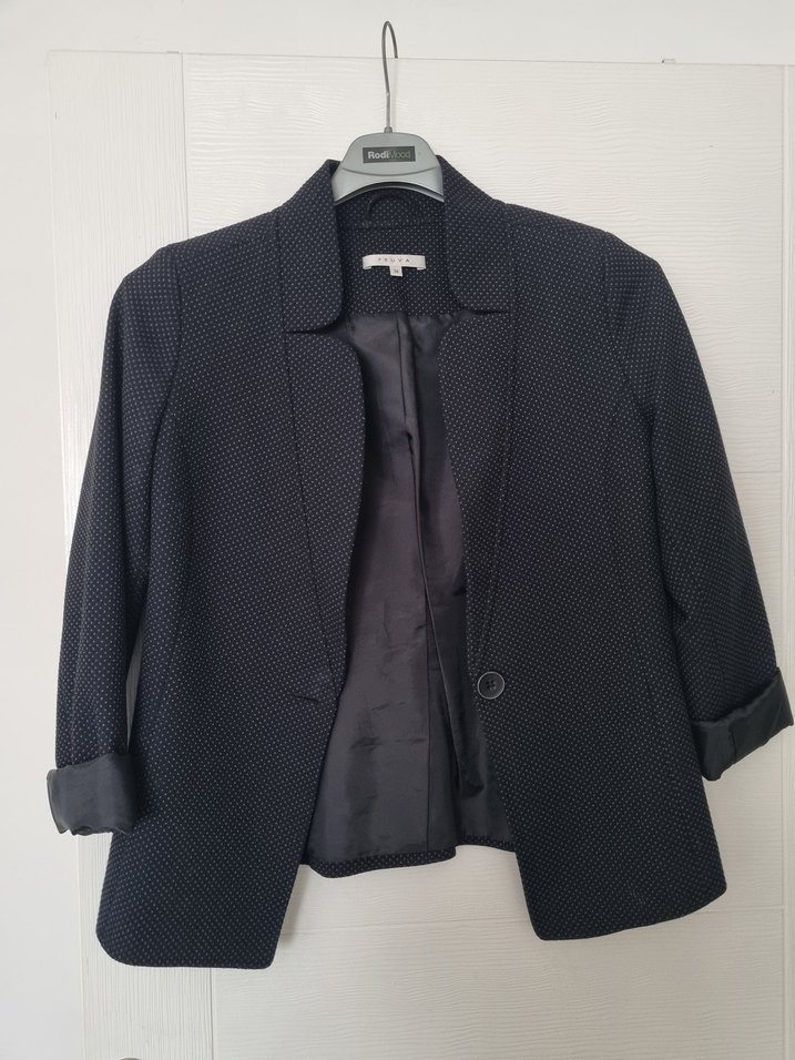 Pruva marka, siyah renk, düğmeli, kesik yaka, uzun kollu kadın blazer. Sentetik kumaştan, kısa uzunlukta ve rahat kesim. Ofis ve günlük sokak stiline uygun. Belli belirsiz arkasında bir yerde tülerme var.