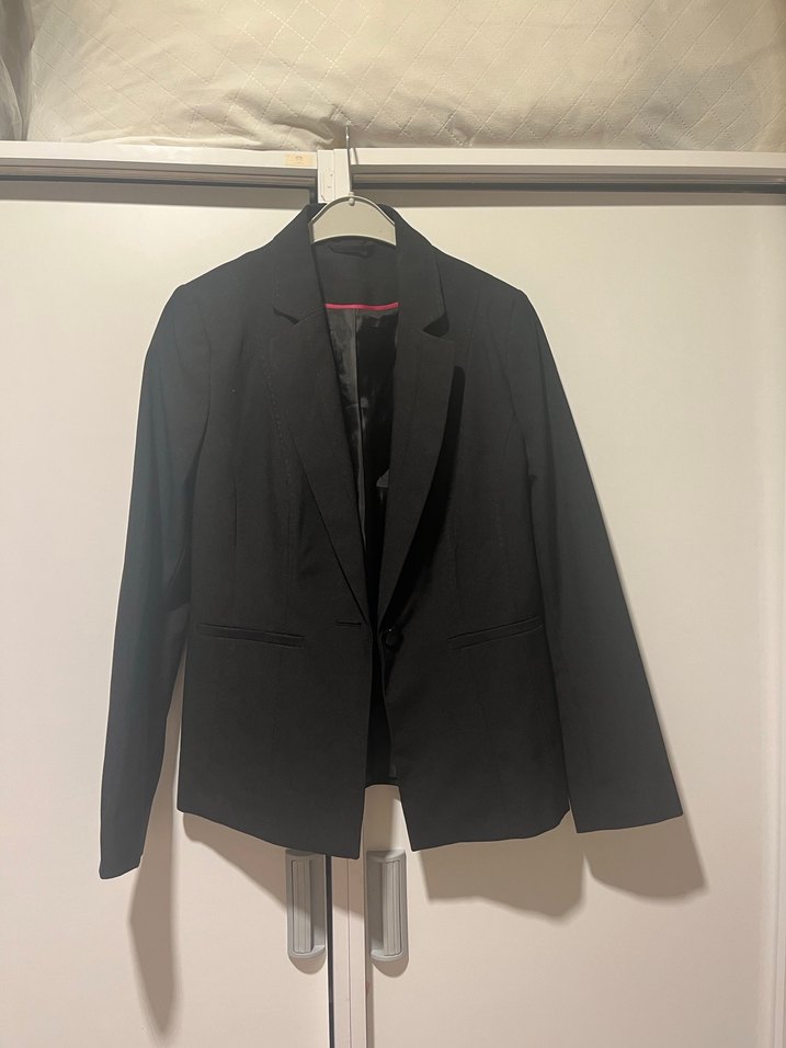Düğmeli ön kısmı, koyu siyah renk ve notched yakasıyla, uzun kollu kadın blazer ceket. Orta boy ve düz kesim, iş ve günlük kullanıma uygun.