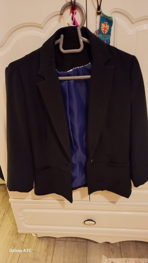 Düğmeli, sivri yaka, uzun kollu siyah kadın blazer. Normal boyda, midi kesim ve düzenli kalıplı. Sentetik kumaştan, ofis ve günlük kullanıma uygun.