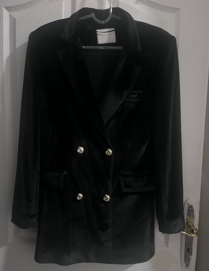 Siyah, düğmeli, uzun kollu, normal uzunlukta kadın blazer. İpek gibi kumaştan, klasik zarif goth tarzında, ofis için uygun. Özel koleksiyon ürünü