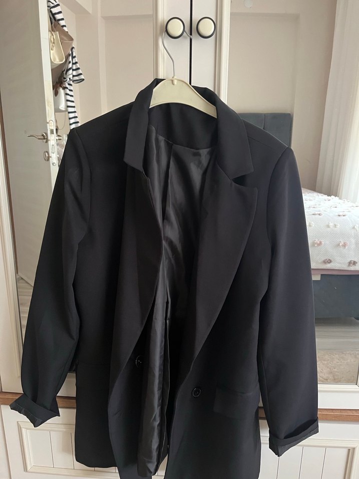 Düğmeli, uzun kollu, siyah kadın blazer ceket. Normal kesim ve midi boyda, düz desensiz, ofis ve sokak modasına uygun.cok az kullanıldı