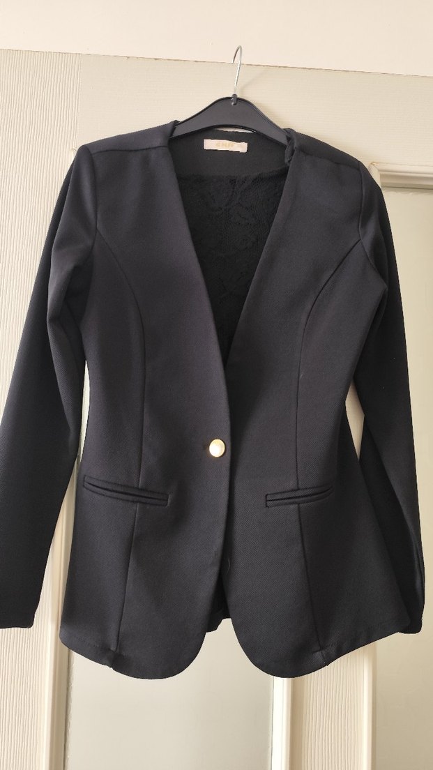 Düğmeli, yakalı siyah kadın blazer ceket, normal uzunlukta ve uzun kolludur. Ofis için klasik ve şık bir seçimdir.