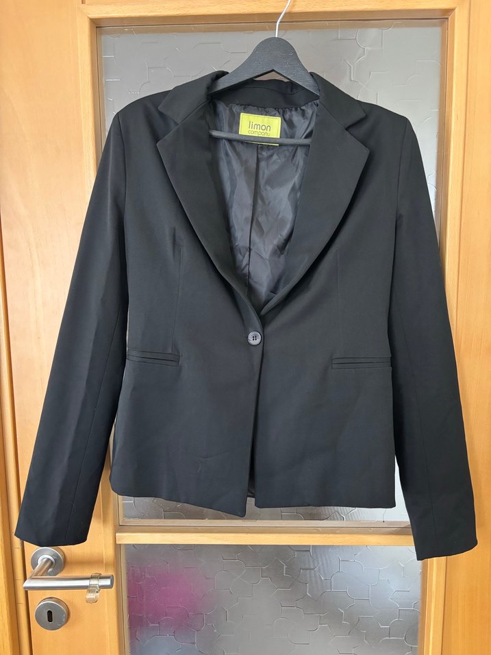 Düğmeli, notched lapel yakalı siyah kadın blazer ceket. Uzun kollu, regular fit ve midi boyda, ofis için ideal. Düz ve desen içermeyen sentetik kumaştan. 36 beden hiç kullanılmadı. Omuzdan tam boy 60cm, kol boy 63cm. #ceket #ofis #limoncompany #kadın