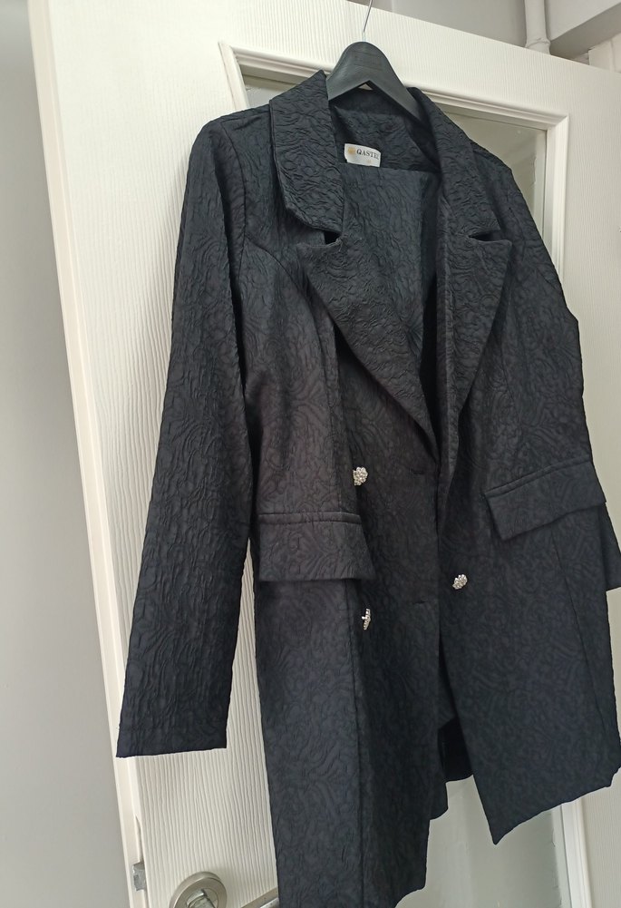 Uzun kesim siyah blazer, düğmeli ve kesik yakalıdır. Ofis için modern klasik tarzda, regular fit ve uzun kolludur. Kendinden kabartmalı bir kumaşı var.Işıktan kaynaklı rengi farklı duruyor fakat hiçbir solma vs yoktur iki kez kullandım tertemizdir.