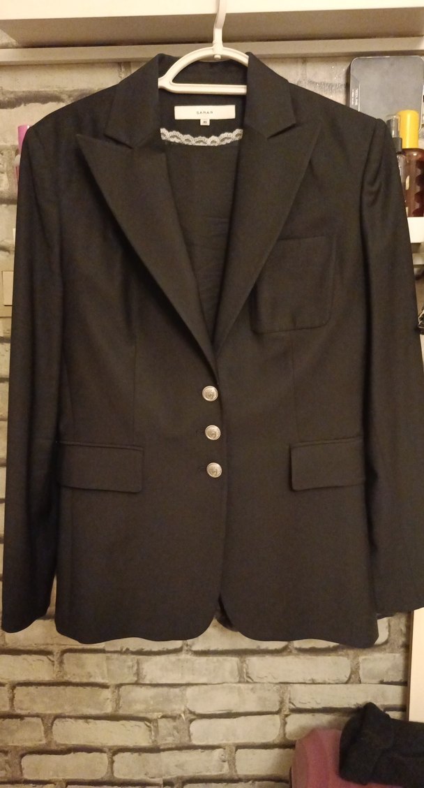 Düğmeli, kesik yaka siyah kadın blazer ceket pantolon takımı ipeksi kumaştan, klasik ve iş ortamına uygun uzun kollu model.