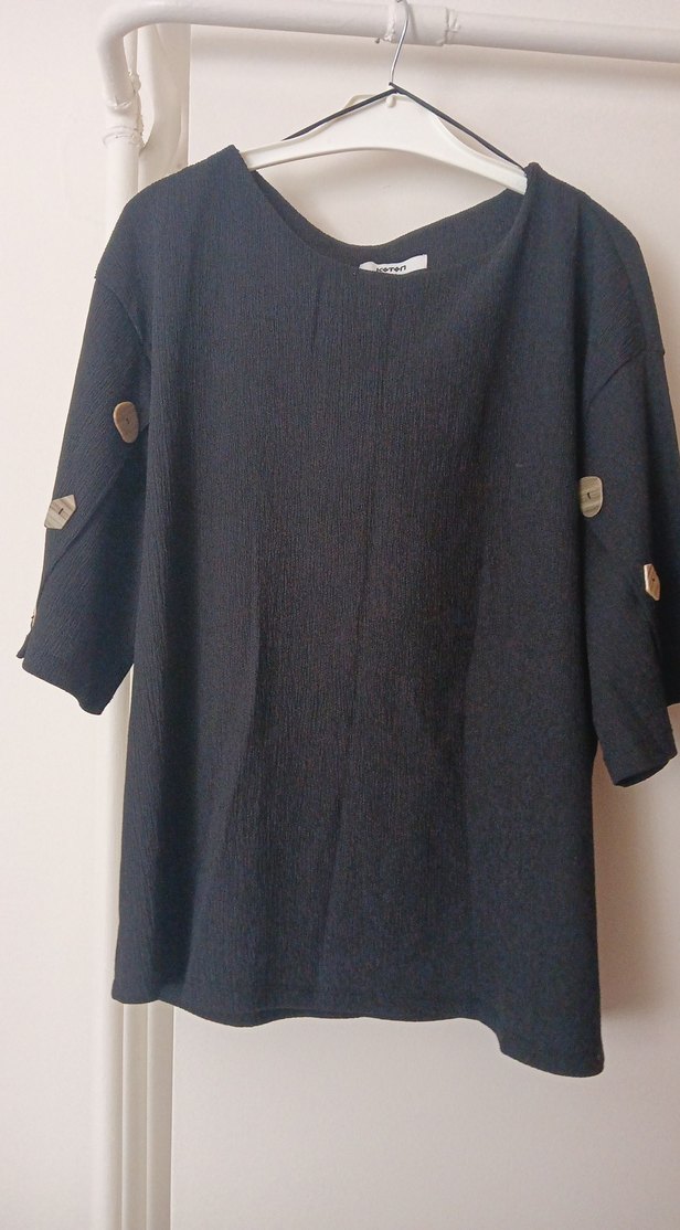 Düğmeli, kısa kollu, yuvarlak yakalı, bol kesim siyah bluz. Orta boyda ve gündelik kullanıma uygun.