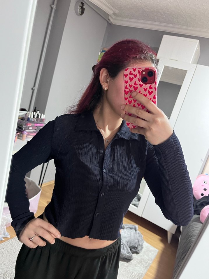 Düğmeli, uzun kollu, yakalı ve fitted kesim siyah bluz. Pürüzsüz sentetik kumaştan üretilmiştir, günlük kullanım için uygundur.