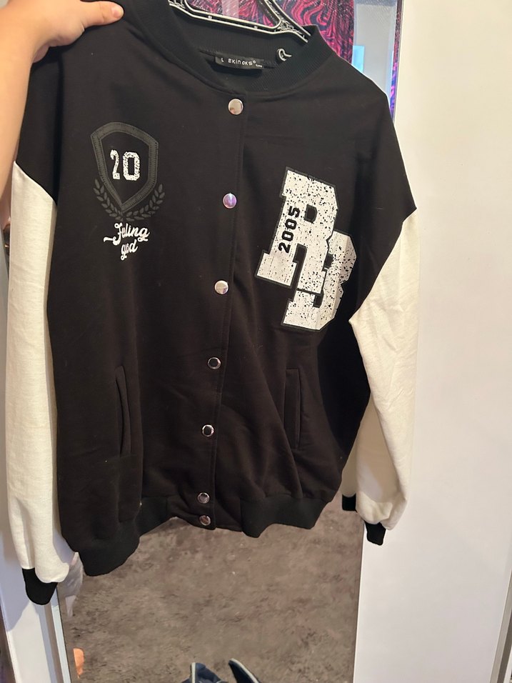 Pamuklu, düğmeli, uzun beyaz kollu, siyah baskılı kadın bomber ceket. Salaş kesim ve bisiklet yaka ile günlük kullanıma uygun.