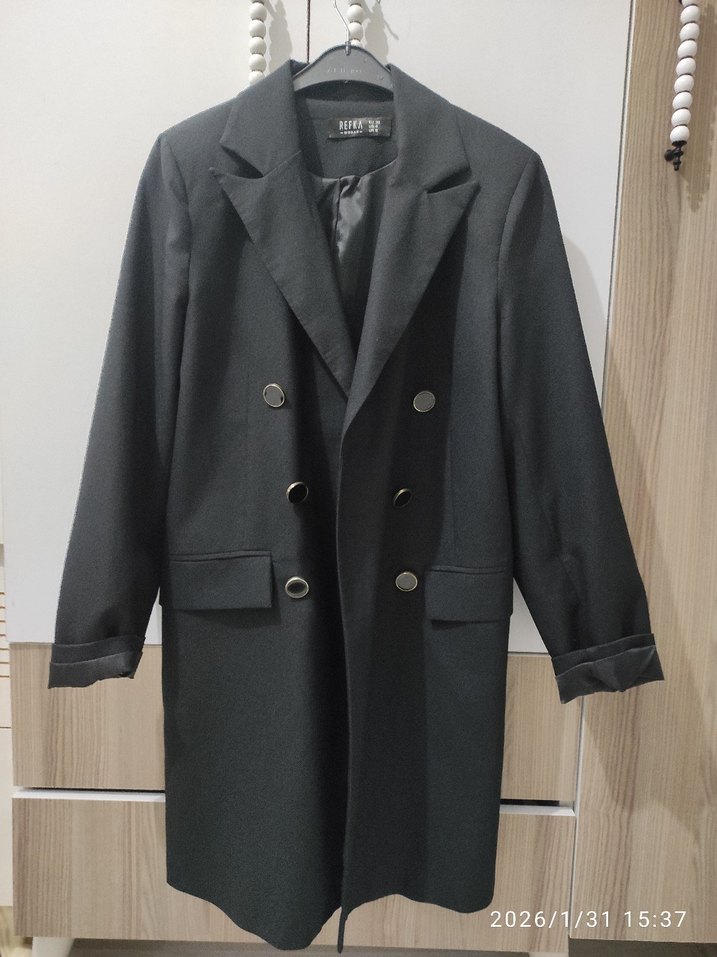 Siyah kadın ceketi, düğmeli ve kesimli yaka detayına sahiptir. Uzun kollu, uzun boylu ve regular fit tasarımıyla ofis ve günlük kullanıma uygundur. Sentetik kumaştan üretilmiştir.