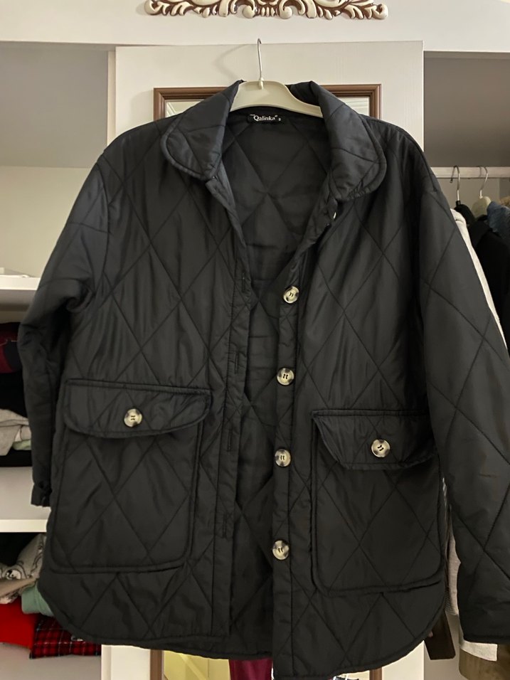 Düğmeli, siyah kadın ceket; kesik yaka ve uzun kollu. Gevşek kesim, midi boy ve düz desensiz, günlük kullanıma uygun.