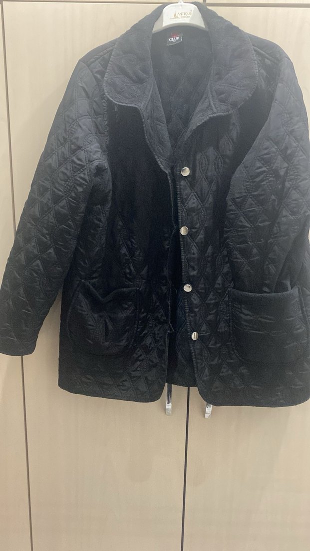 Düğmeli, siyah kadın ceket. Notlu yaka, uzun kollu ve normal midi boyda. Yumuşak ve sıcak kumaştan, günlük sokak stili için uygun.