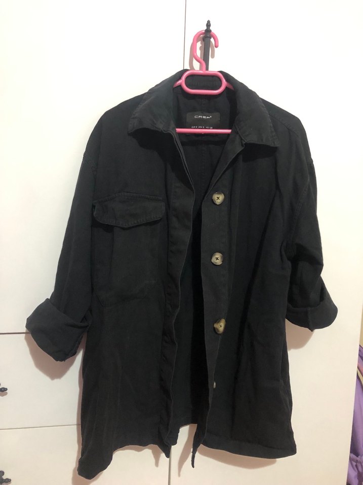 Düğmeli, siyah denim kumaştan, uzun kollu ve notched yaka detaylı bol kesim midi uzunluğunda kadın ceket. Günlük sokak stiline uygun minimalist tasarım.