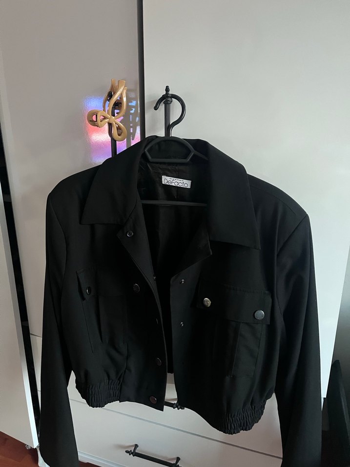 Düğmeli siyah kadın ceket, çentikli yakalı ve düğmeli ön kısmı ile dikkat çeker. Uzun kollu, midi boyda ve sentetik kumaştan üretilmiştir. İş ve gündelik kullanıma uygundur.