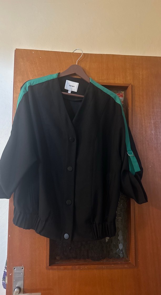 Düğmeli, uzun kollu, siyah kadın ceket. Yeşil omuz şeritleri ve notched yaka detayına sahip, sentetik kumaştan üretilmiş. Günlük sokak stili için uygun. Az giyildi, deformesi yok.