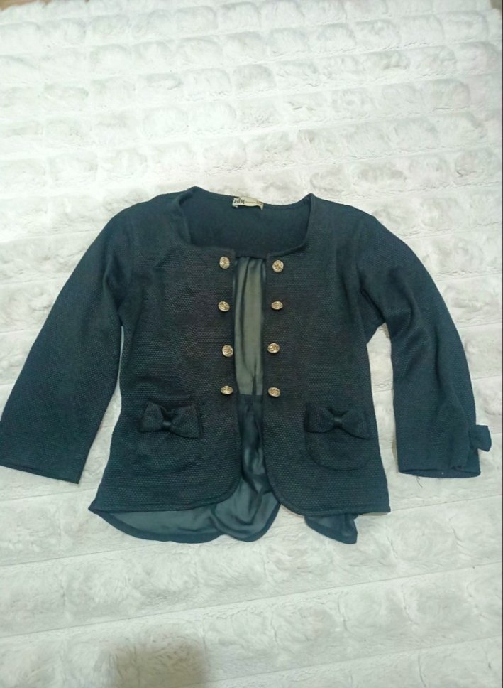 Düğmeli, uzun kollu, siyah kadın ceket. Yumuşak ve sıcak kumaştan, ceplerinde küçük fiyonk detayları var. arkası transparan tül fiyonk detaylı.
