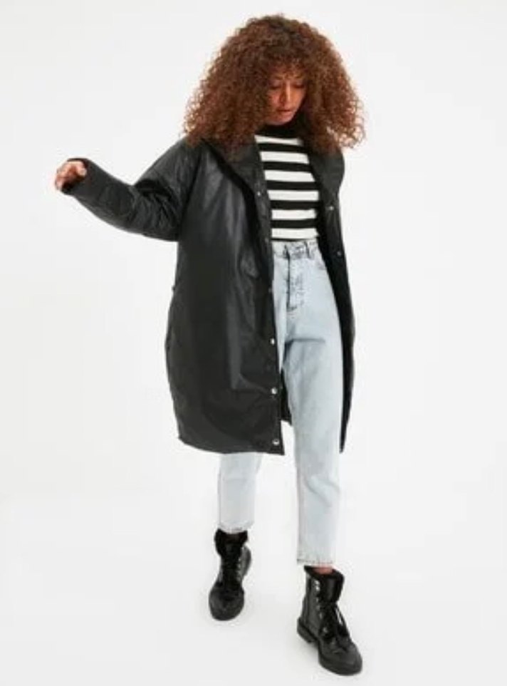Düğmeli, siyah kadın ceketi, kesimli ve notched yaka detaylıdır. Uzun kollu ve midi boyda, sentetik kumaştan üretilmiştir.