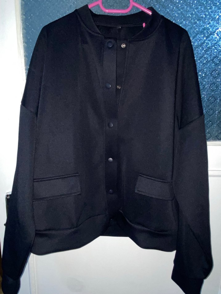 Düğmeli, uzun kollu siyah kadın ceket. Normal boy, minimal tarzda ve rahat kesimle günlük kullanıma uygun. M beden fakat kalıbı geniş