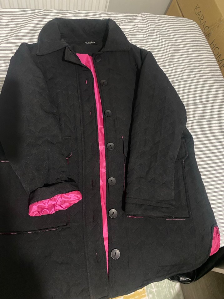 Düğmeli, siyah kadın ceketi, yakası kırımlı ve uzun kolludur. Bol kesim ve pembe astarıyla gotik ve Paris tarzını birleştirir. Günlük kullanıma uygundur.