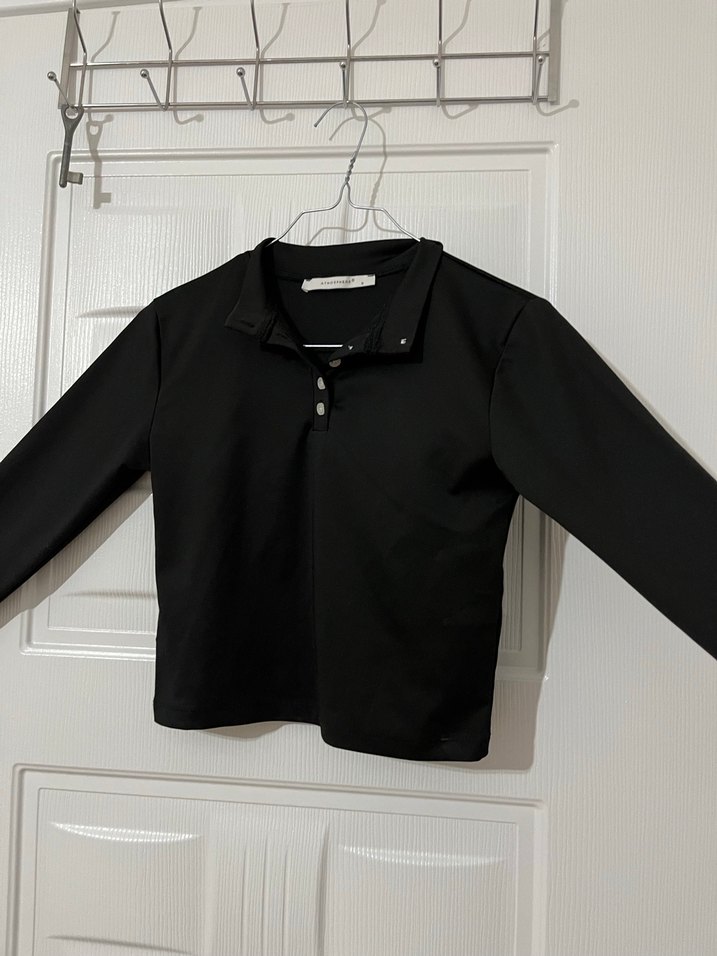 Düğmeli, uzun kollu, yakalı ve fitted kesimli siyah kadın cropu.Minimalist ve goth tarzda, normal midi boyda, sentetik kumaştan üretilmiştir.