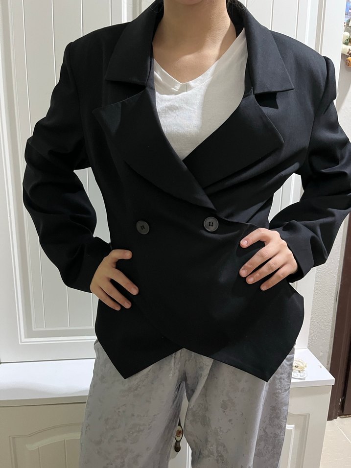 Xs bedene fotodaki gibi olur, M beden de giyebilir Düğmeli, siyah kadın blazer ceket, kesik yaka ve uzun kolludur. Regular kesim ve midi boyda, sentetik kumaştan üretilmiştir. Ofis ve günlük stil için uygundur.