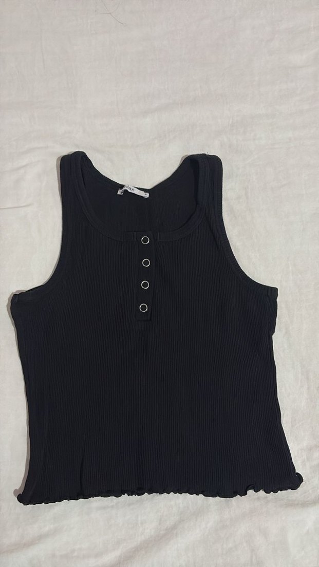 Pamuk kumaştan yapılmış, düğmeli ve kayık yaka detaylı siyah, kolsuz, vücuda oturan crop top. Günlük sokak stili için uygundur.