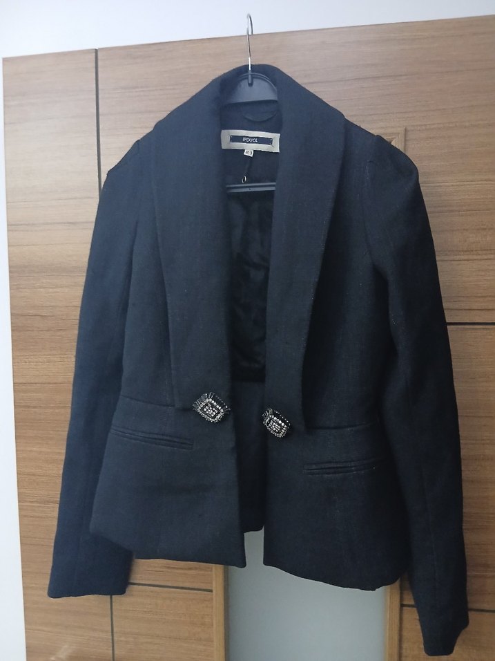 Düğmeli, siyah denim kumaştan yapılmış, normal boy midi uzunluğunda, klasik ve şık kesime sahip kadın blazer. Ofis ve sokak stiline uygun.