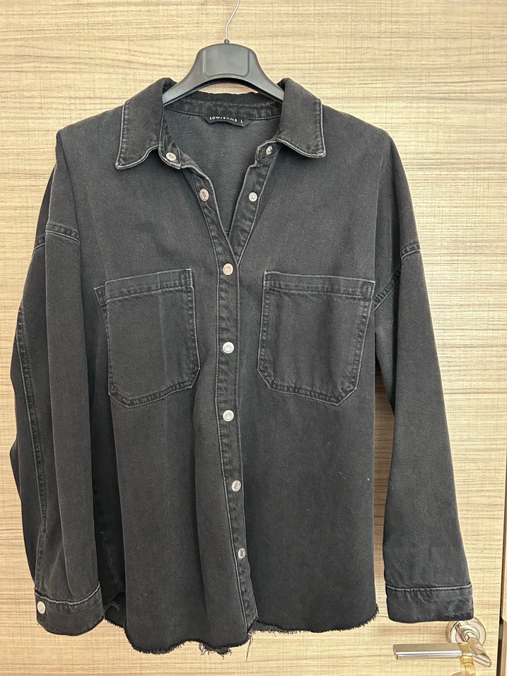 Siyah denim kumaştan üretilmiş, düğmeli, uzun kollu, notched yakalı, bol kesim kadın ceket. İki ön cepli, gündelik sokak stili için uygun.