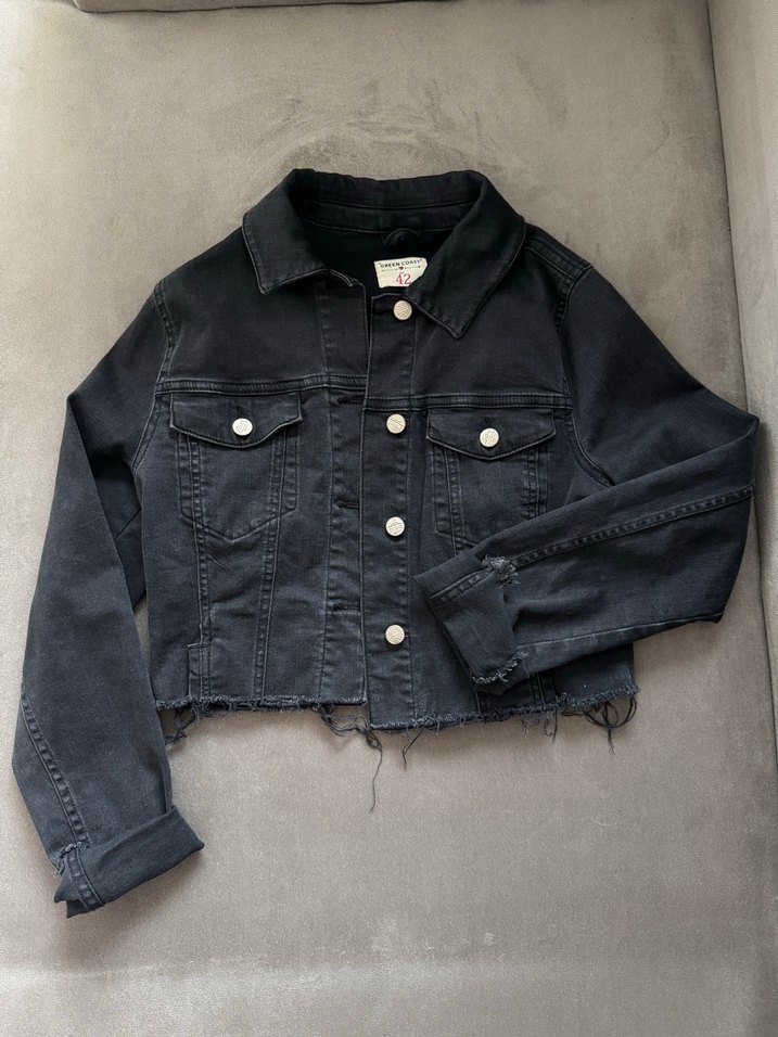 Düğmeli, uzun kollu, siyah denim kadın ceket. Normal boy, keskin yaka ve ham kenar detayına sahip, gündelik sokak tarzı için uygun. S-M