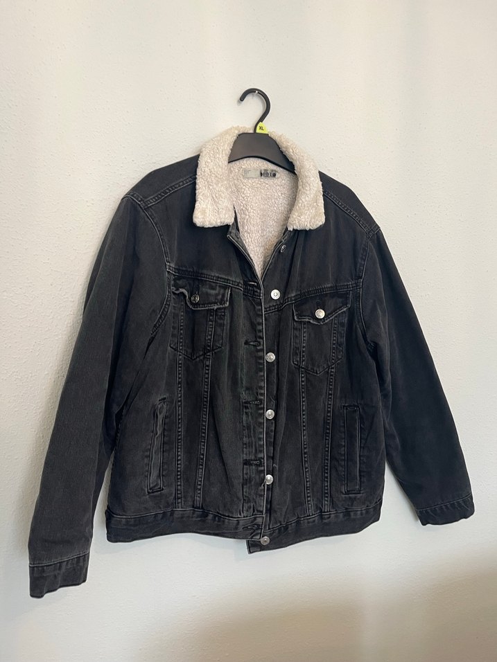 Düğmeli, yumuşak iç astarlı siyah denim ceket. Salaş kesim, notlu yaka ve uzun kollu, rahat sokak tarzı için uygun.