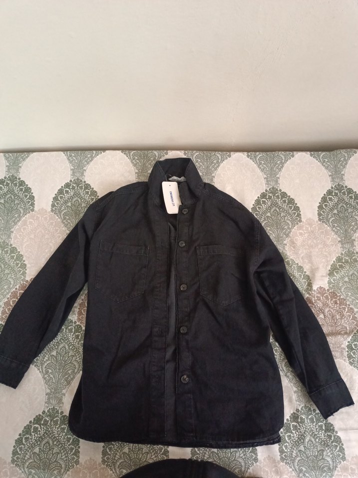 Düğmeli, uzun kollu, siyah kadın denim ceket. Notlu yaka, bol kesim ve normal midi boyuyla günlük ve sokak stiline uygun.