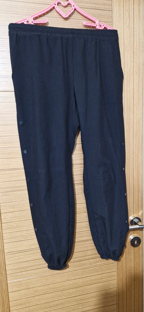 Düğmeli detaylı, midi boy, bol kesim siyah denim pantolon. Günlük rahat kullanım için uygun, sokak stilinde.