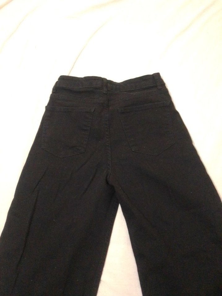 Düğmeli, siyah renkli, midi boy ve dar kesim denim pantolon. Günlük sokak stiline uygun sade ve şık tasarım.