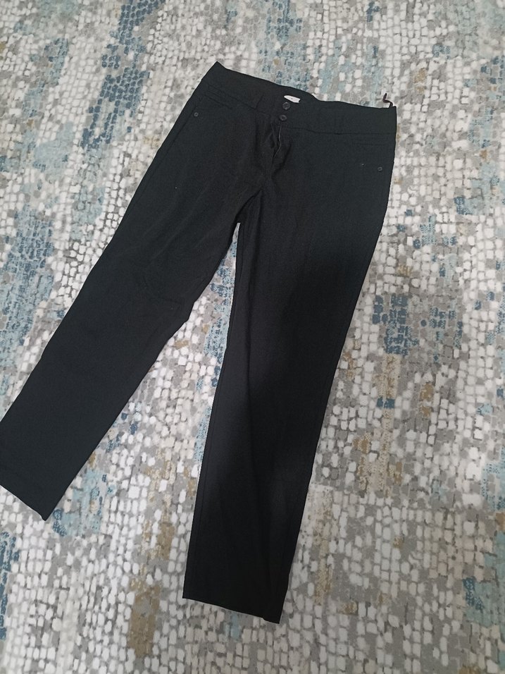 Düğmeli, siyah renkli denim kumaştan yapılmış, normal boy midi uzunluğunda ve rahat kesime sahip kadın pantolon. Günlük kullanıma uygundur.