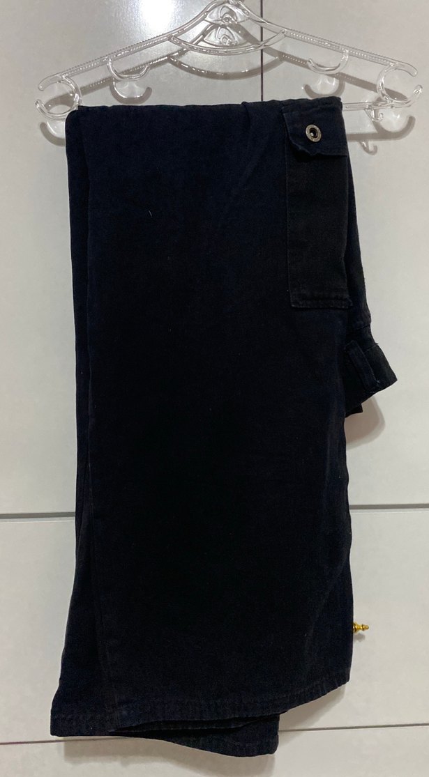 Düğmeli detaylı, siyah renkli kadın denim pantolon. Rahat kesim ve midi boy, sade minimalist tasarıma sahip. Fermuarı bozuk yapılabilir