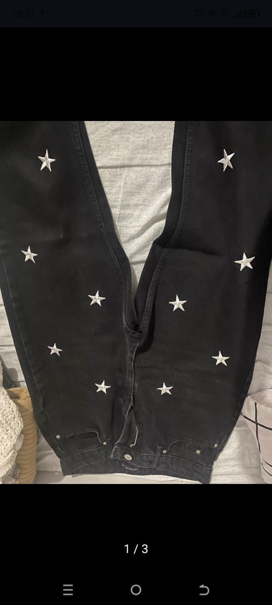 Düğmeli, siyah denimden yapılmış, yıldız detaylı, dar kesim kadın pantolon. Midi boy, günlük sokak tarzına uygun. ✨