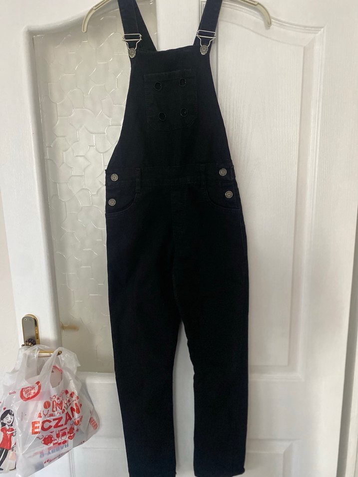 Düğmeli Siyah Kadın Denim Salopet