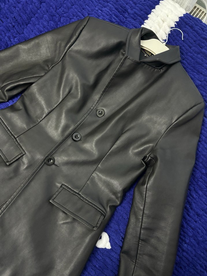 Düğmeli, siyah uzun deri kadın ceketi, kesik yaka ve uzun kolludur. Düzenli kesimi ile ofis kullanımına uygundur.