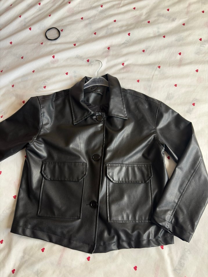Siyah kadın deri ceket, düğmeli ve kesik yakalıdır. Uzun kollu, normal kesim ve iki ön cepli, günlük sokak stili için uygundur.