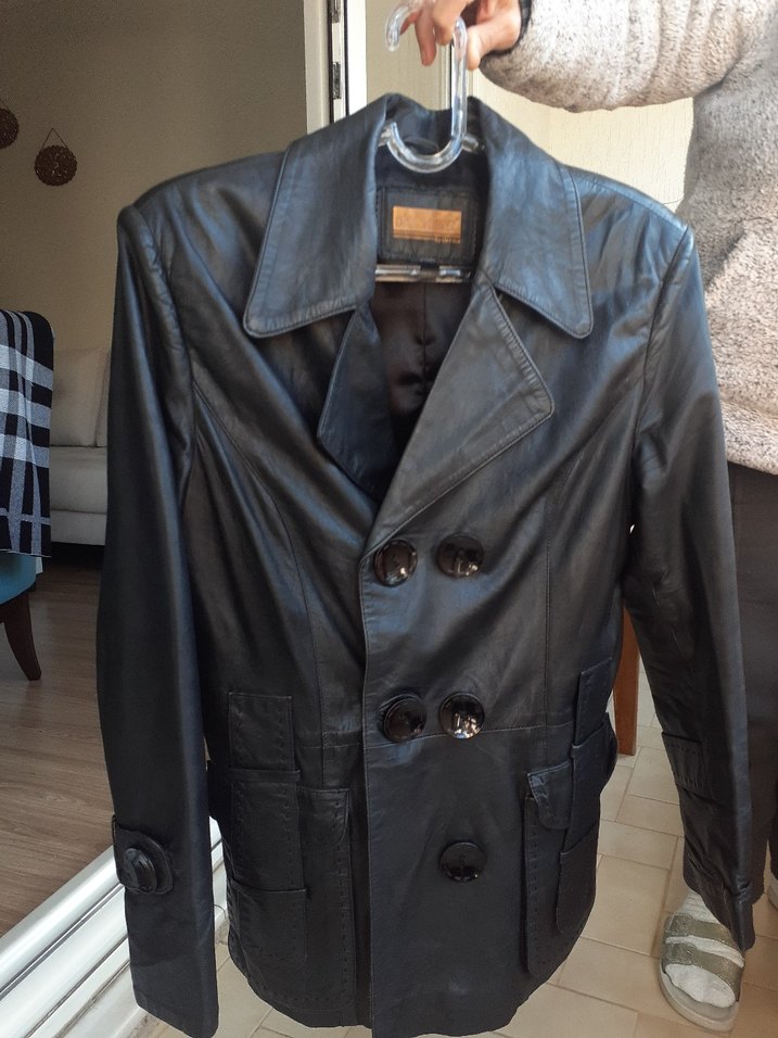 Düğmeli, siyah deri kadın ceket, notalı yaka ve uzun kolludur. Ofis kullanımı için uygun, normal kesimdir. 2 yerinde hatası vardır fotoya ekledim.
