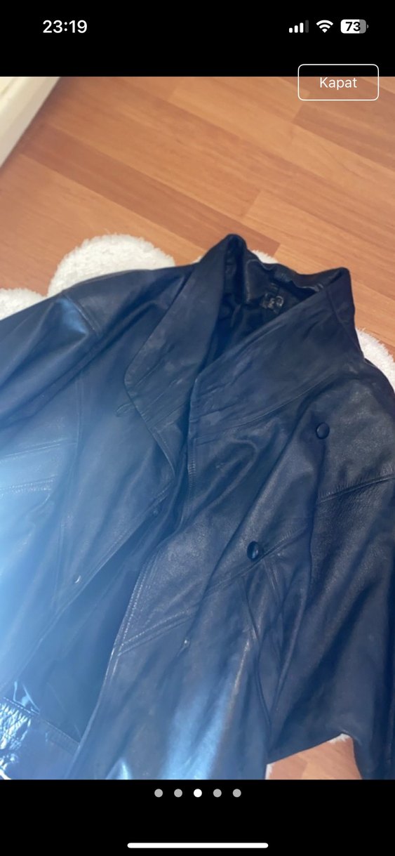 Düğmeli ön kısmı ve kesik yakasıyla siyah deri ceket, bol kesim ve uzun kollu sokak stili için uygundur. Uzun boyu ve desensiz yapısıyla günlük kullanıma uygundur.