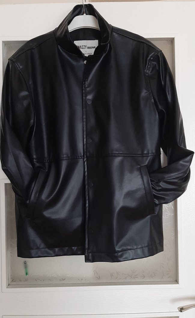 Düğmeli, siyah erkek deri ceket, keskin yaka ve uzun kollu. Regular kesim, midi boyda, sokak modası için uygun.