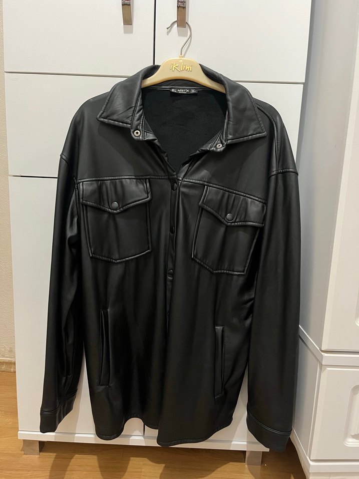 Düğmeli cepleri, uzun kollu ve notlu yaka detaylı siyah kadın deri ceket. Normal midi boy ve bol kesim, sokak stiline uygun. Günlük kullanıma uygundur.