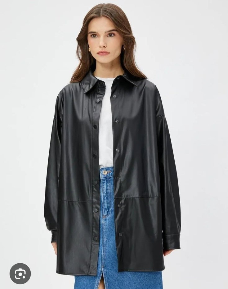 Düğmeli, V yakalı, midi boy, bol kesim siyah deri gömlek. ceket olarak da kullanılabilir. ceplidir. deformesi yoktur. omuzdan uzunluğu 86cmdir.