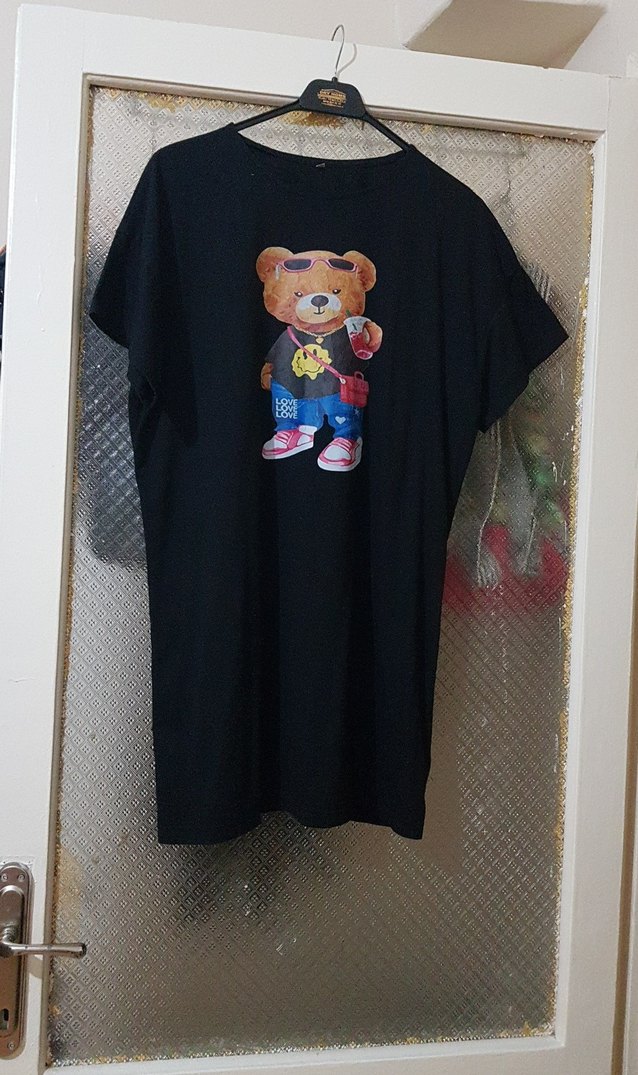 kısa kollu, siyah kadın mini elbise tişörtü, baskılı ayı deseni ve yuvarlak yakaya sahip, rahat kesim ve sentetik kumaştan üretilmiştir.