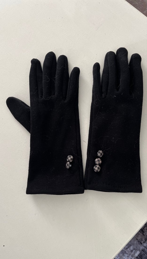 Siyah düğmeli kadın eldiveni, yumuşak ve sıcak kumaştan üretilmiştir. Gotik tarzıyla rahatlık sağlar. Bir düğmesi kaybolmustur.